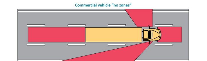 Commercial vehicle 'no zones' are the blind spots around large commercial vehicles where the driver has limited or no visibility of other vehicles. Avoid driving in these areas when near large trucks.