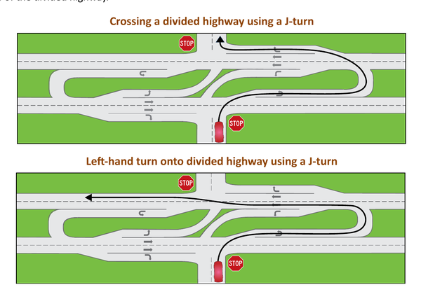 At a J-turn, drivers on the side street always make a right turn onto the divided highway first. To cross the highway or turn left, you then enter the designated left-turn lane leading to the median opening and complete a U-turn. This design reduces broadside crashes.