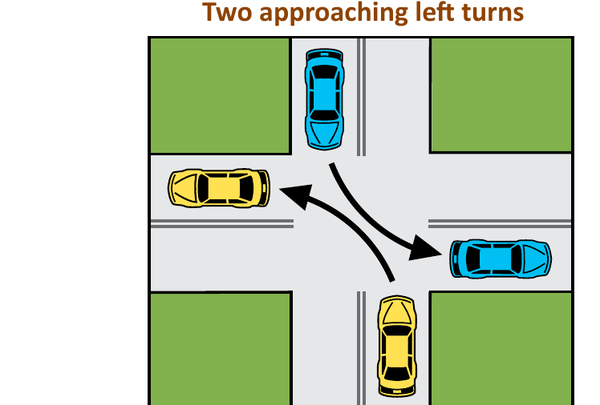 What does this diagram show about two vehicles making left turns simultaneously from opposite directions?